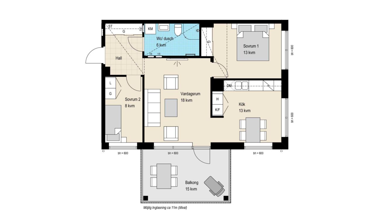 I lägenheten finns ett trevligt kök med bra förvaring, här kan du laga goda middagar till dina nära och kära. Från vardagsrummet kommer man ut till den 15 kvm stora balkongen. Här finns det plats för både en loungedel och matplats. Är du med i ett tidigt skede kan du köpa till inglasning, då kan du njuta här större delen av året.