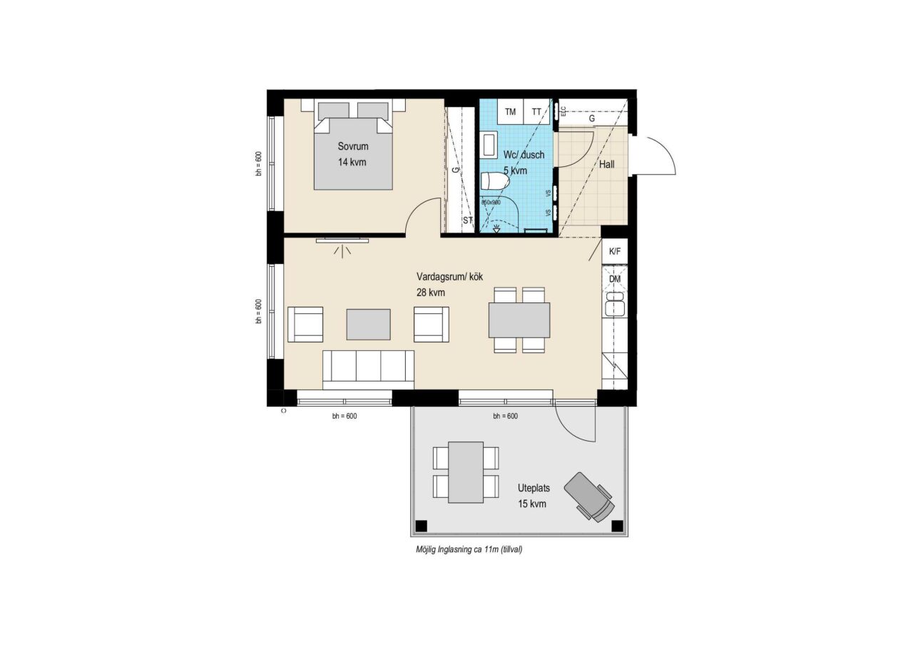Denna tvåa är smart planerad med en öppen planlösning mellan vardagsrum och kök. Från köket kommer man ut till den 15 kvm stora uteplatsen. Här finns det plats för både en loungedel och matplats. Är du med i ett tidigt skede kan du köpa till inglasning, då kan du njuta här större delen av året.