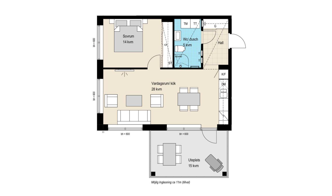 Denna tvåa är smart planerad med en öppen planlösning mellan vardagsrum och kök. Från köket kommer man ut till den 15 kvm stora uteplatsen. Här finns det plats för både en loungedel och matplats. Är du med i ett tidigt skede kan du köpa till inglasning, då kan du njuta här större delen av året.