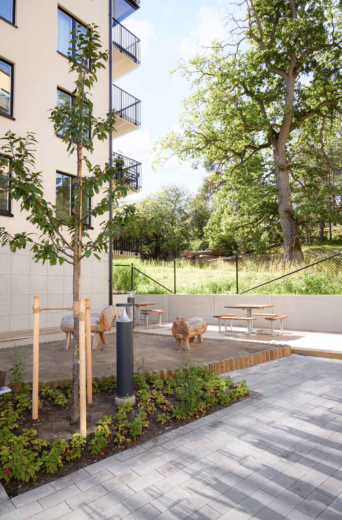 Kring husen finns gemensamma ytor med bord och pergola där man kan umgås med sina grannar och vänner. Det finns också små lekplatser för de mindre barnen. I den terrasserade sluttningen upp mot tallbacken finns sittvänliga murar. Ett gångstråk går genom kvarteret och upp genom tallbacken för att fortsätta ner mot Gustavsbergs centrum.