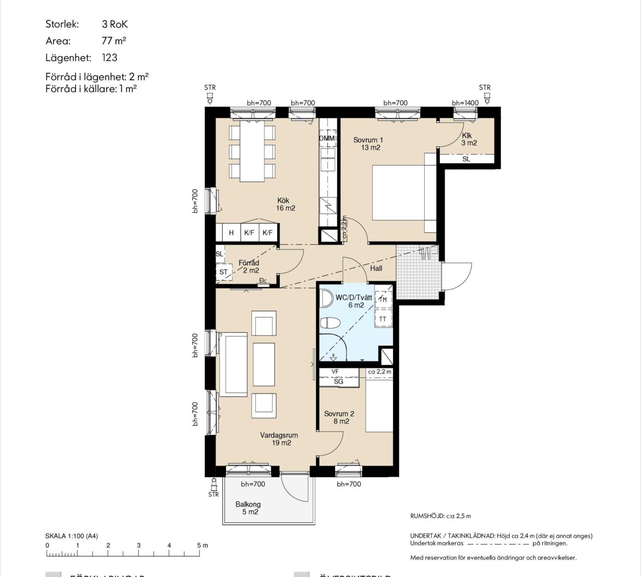 Köket i dessa treor är rymligt och separat. Det stora sovrummet har en rejäl klädkammare. Badrummet, som man når från hallen, är utrustat med tvättmaskin och torktumlare. Det rejäla vardagsrummet samt det mindre sovrummet vetter mot uteplats/balkong i söder.