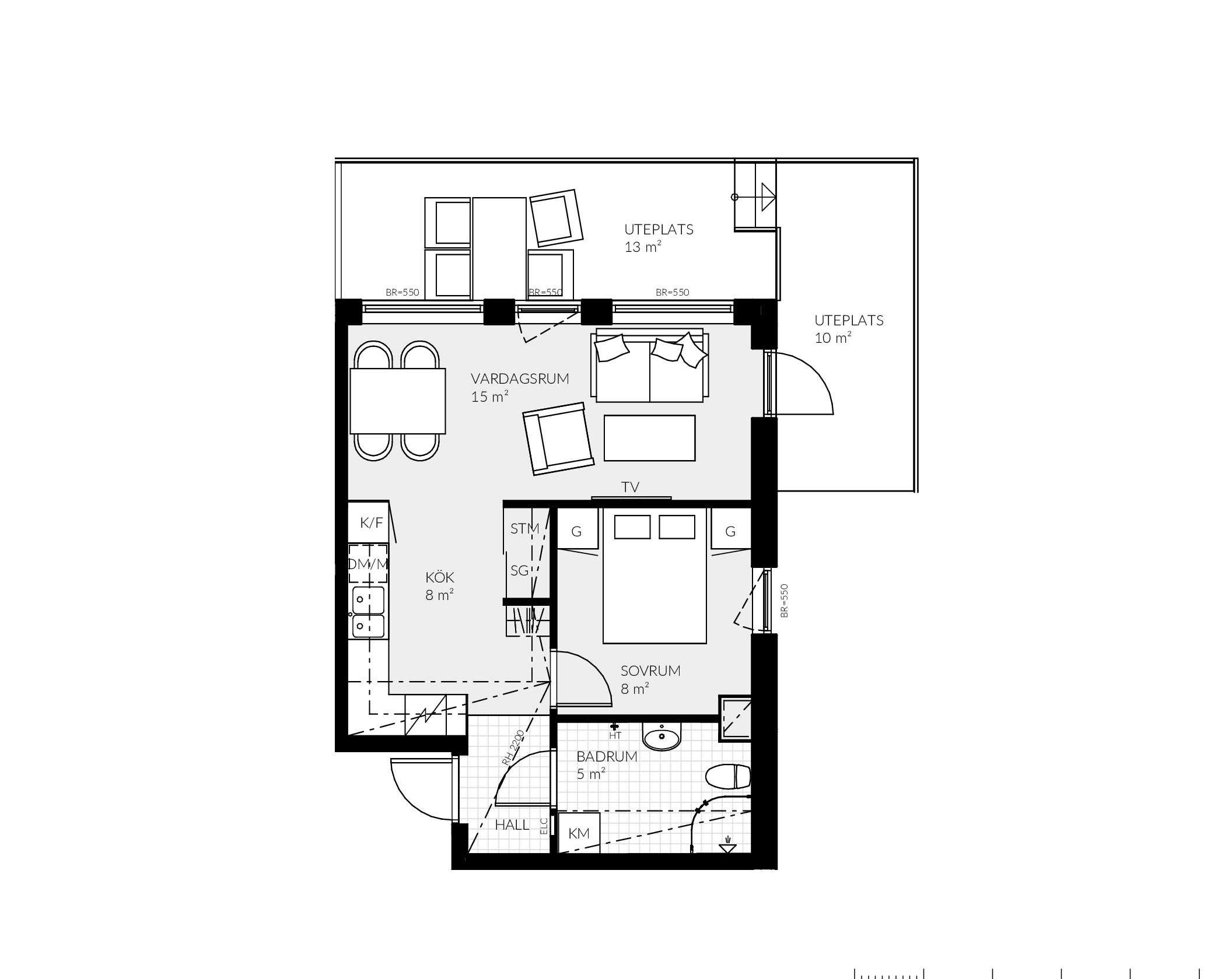 Trevlig tvåa med ett bra kök i vinket och en stor uteplats på 23 kvm