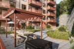 Husets nästan 800 kvadratmeter stora innergård ligger naturligt inramad. Här tar du en kaffe efter jobbet, spelar boule, tränar golfputten, leker med barnen eller dukar upp middag med släkt och vänner.